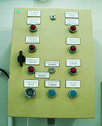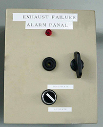 The exhaust failure alarm panel is located between wet stations D and E in NFF (CWB) Phase II. As soon as a failure in any of the exhaust systems is detected, the buzzer and alarm light will be triggered and users must report to our staff.
