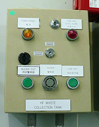 The HF (hydrofluoric) waste collection tank alarm system is located between wet stations D and E in NFF (CWB) Phase II. As soon as the level of HF waste in the tank rises above a certain level, the buzzer and the alarm light will be triggered. When that happens, users must report to our staff immediately.