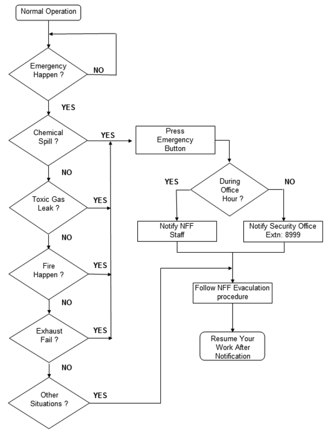 The NFF (CWB) Emergency Response Plan tells you what to do in an emergency. NFF (CWB) users should familiarize themselves with the plan before commencing work in the NFF (CWB) and should act accordingly when an emergency occurs. The following contact points are also given in the Plan.
