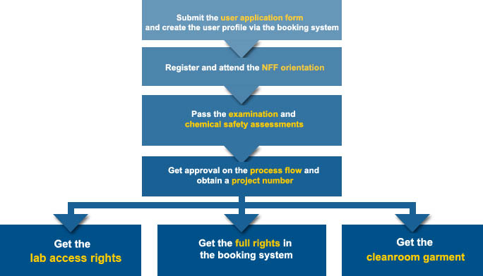 There are two ways to use NFF (CWB) services. One is to apply to become an NFF (CWB) user and another one is to submit a job order to NFF (CWB) for facility services. The two ways have different procedures to go through.